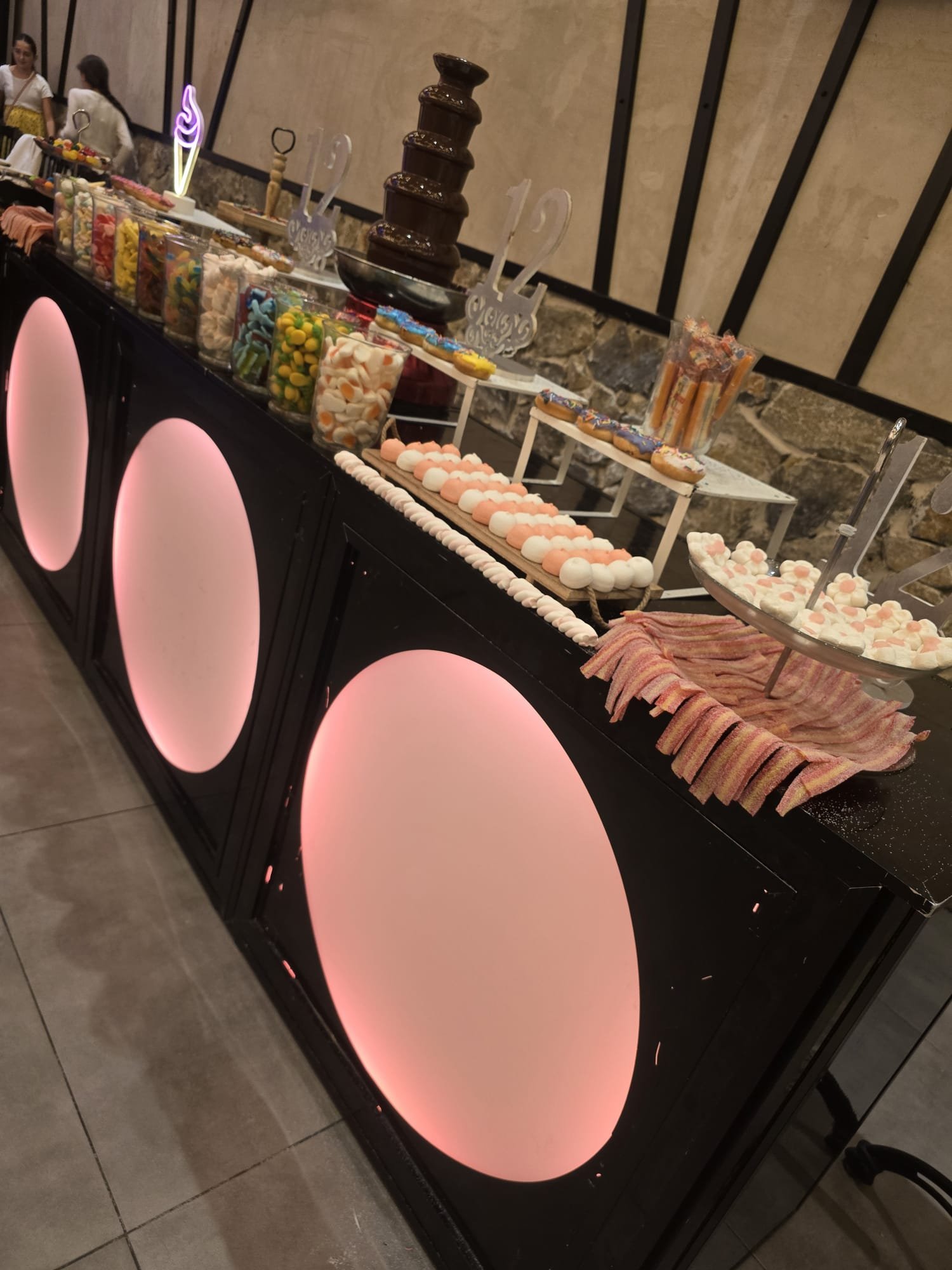 קיר דונאטס מרובע עומד על סטנד מעץ ובו מגוון של מיני דונאטס צבעוניים בטעמים שונים להמתיק את זמנם של האורחים. נפתח לאחר מנה עיקרית.
